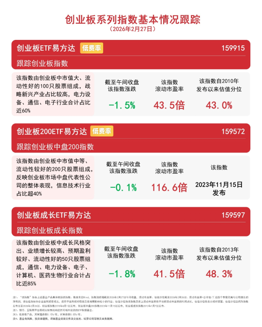 2月27日早盘,CPO、覆铜板等AI硬件概念回调,带动创业板系列指数调整。截至午间收盘,创业板中盘200指数下跌0.1%,创业板指数下跌1.5%,创业板成长指数下跌1.8%,资金逆势布局,创业板ETF易方达(159915)半日净申购超2亿份。
